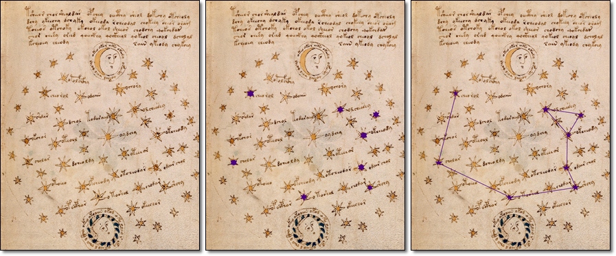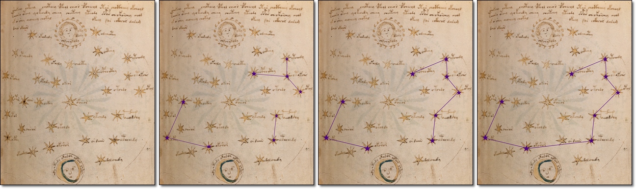 Login to view. (f68r1-f68r3), I think they must be related to each other. I remember different experiments on the contents of these folios, and I want to show my one (hope I didn't missed if someone have already done this). My attention was payed to the stars with circle-points in their centers, as my thought was that it also can be some indication. Thus, I marked them and connected in a few ways. To be honest, my hope was to see something similar to a certain constellation. Unfortunately, I couldn't discern any obvious resemblance with famous constellations. Besides of it, it is not quite correct to compare those schemes to modern drawings of constellations. Therefore I need your opinion.