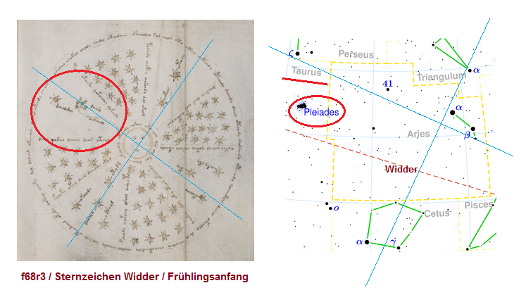 page 68r1 is the summer solstice and page 68r2 is the winter one. You have to mirror the image on 68r2 to get the stars to align up. Page 68r3 are the 4 guardians of Persian lore. hopefully the link works. You are not allowed to view links.