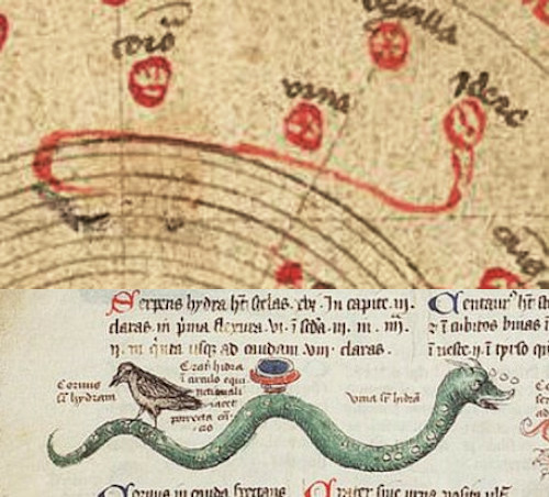 The “wavy line” at the bottom of the diagram represents the Southern constellation Hydra (labelled “Idere”); the label was written next to a snake’s head that appears here instead of the usual asterisk. Next to the middle of Hydra’s body, there’s a constellation labelled “urna” (jar) corresponding to Crater. Another nearby constellation is labelled something like "coroum"[?] (it could be "corvus", the crow). (bottom image from You are not allowed to view links.