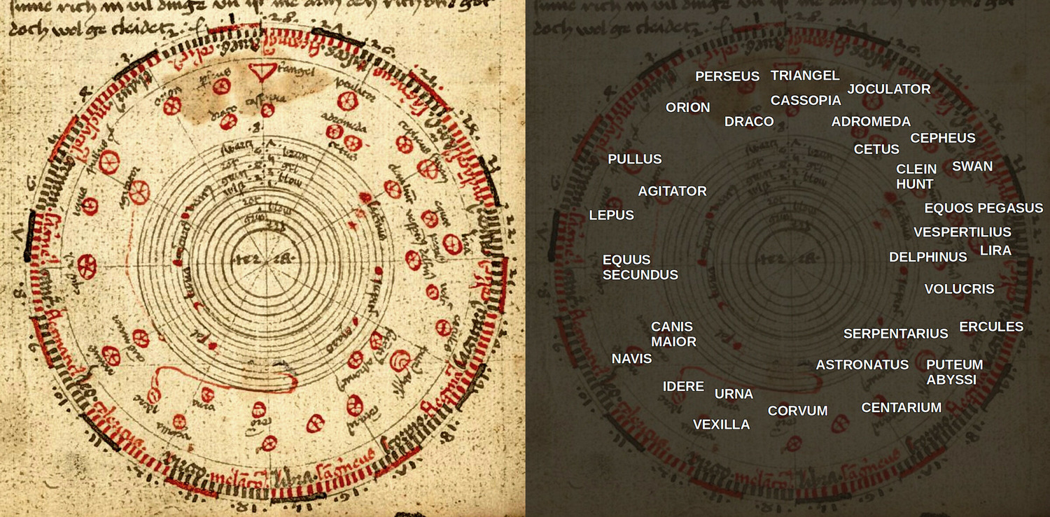 Voynich-wise, the diagram at least points out that most of the labels are simple variants of the ordinary Latin names for the constellations. Some of the problems are: