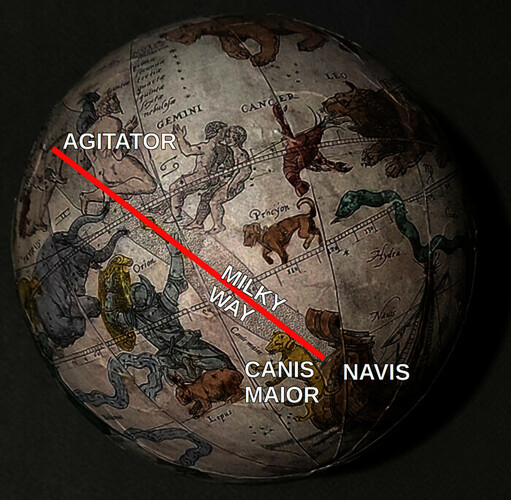Finally, a picture of a celestial globe shows how the Milky way connects Agitator with Canis Maior and Navis. As I wrote above, I speculate that this could be the meaning of the red line going downward from Agitator in the Karlsruhe diagram (but I have no idea why only this segment of the Milky Way should have been drawn).