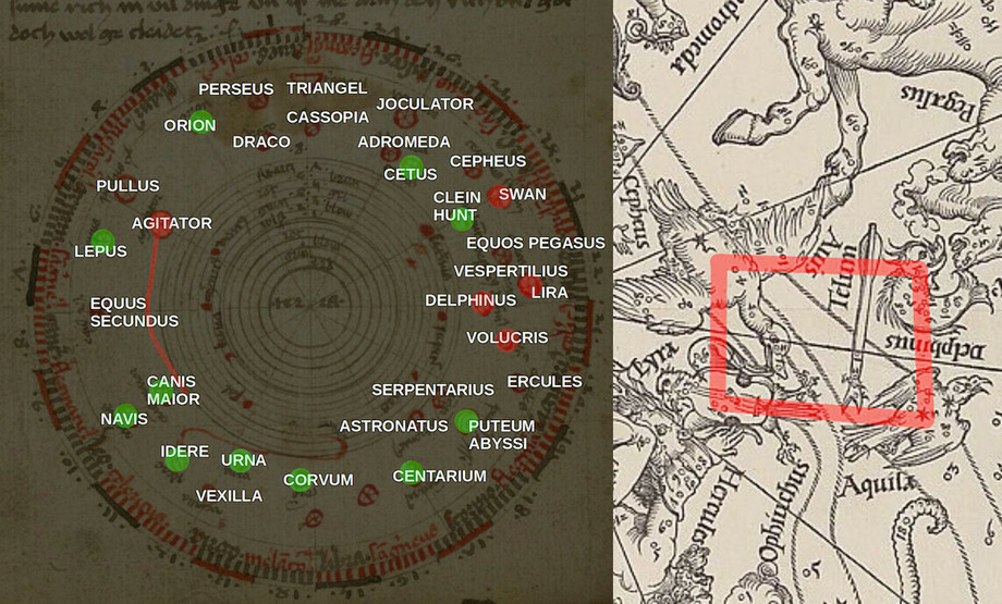 I highlighted in red the rectangle formed by Cygnus (the Swan), Delphinus, Volucris (the Bird), Lyra. If one interprets Volucris as Aquila (the Eagle), a vaguely similar shape can be recognized in the Karlsruhe diagram.
