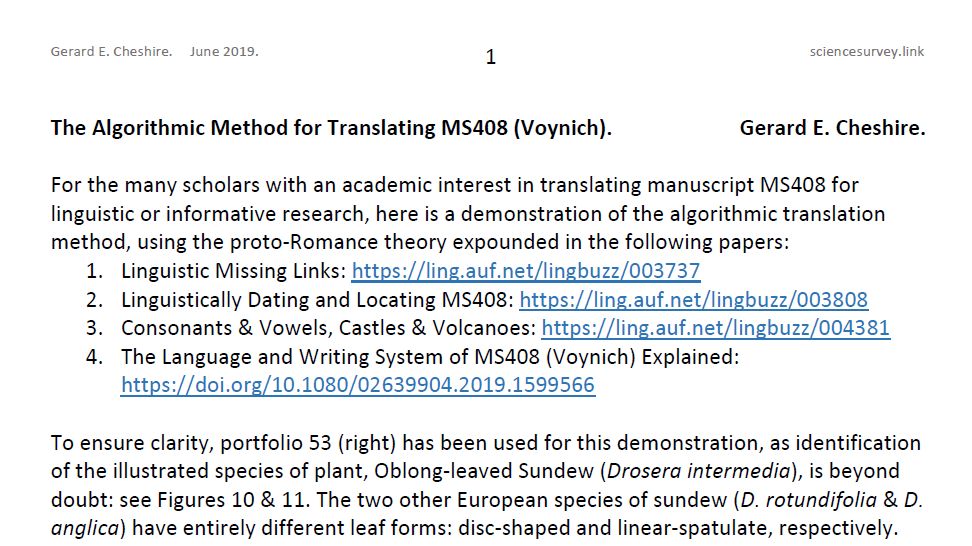 "The Algorithmic Method for Translating MS408 (Voynich). Gerard E. Cheshire, June 2019".