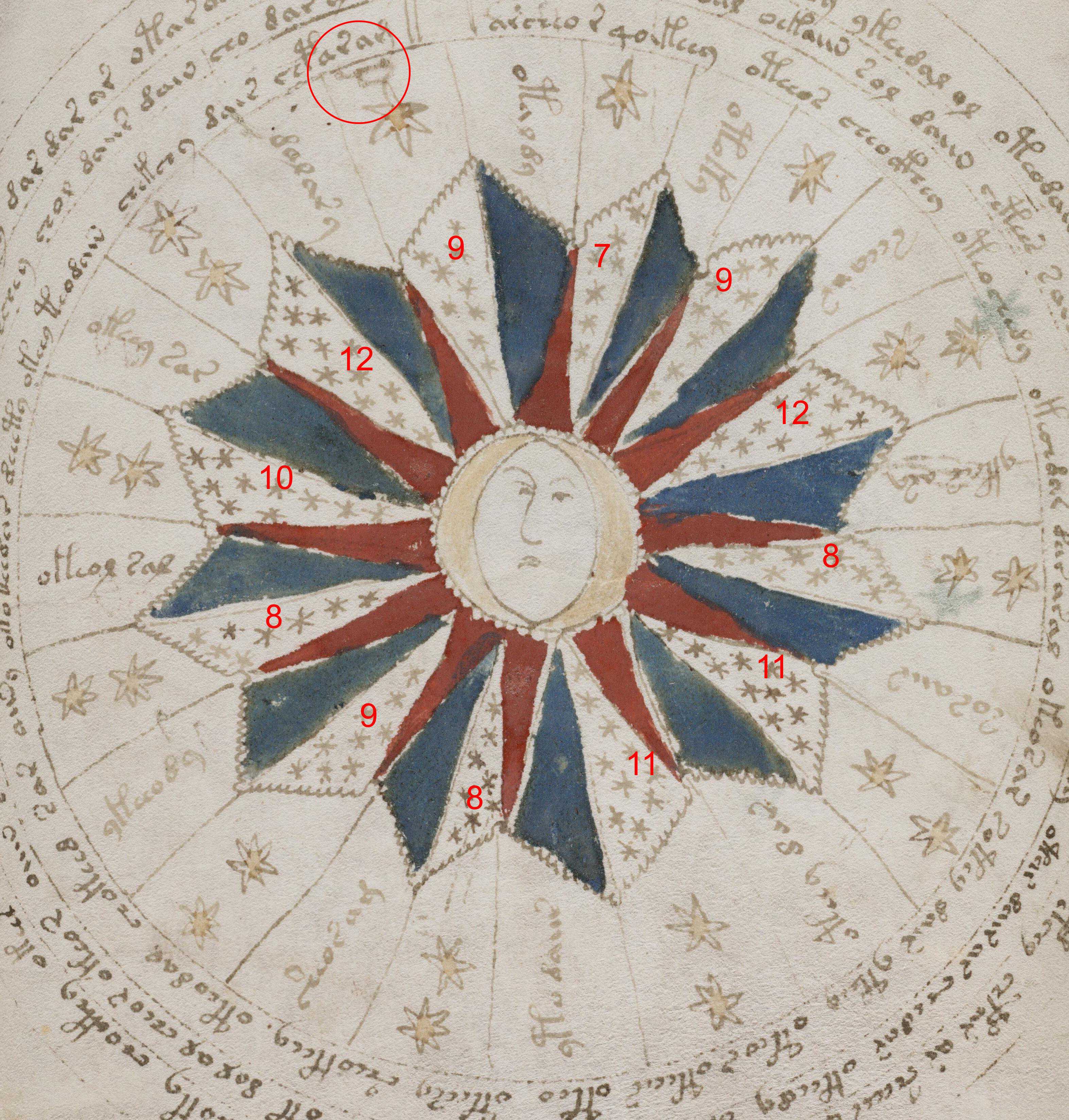 f67r1 has a curious centre about which it is not easy to say whether it's Sun or Moon (or both at once), but it features twelve sectors filled with stars that "blink aboon" (as the old poem goes). At least I supposed these asterisks to represent stars several years ago, and the number of twelve being readily associated with hours, months or Zodiac constellations, I picked the latter option and tried to map the sector labels to constellation names in different languages - not directly, of course, but I mean - to find some pattern that could suggest a match. That to no avail.