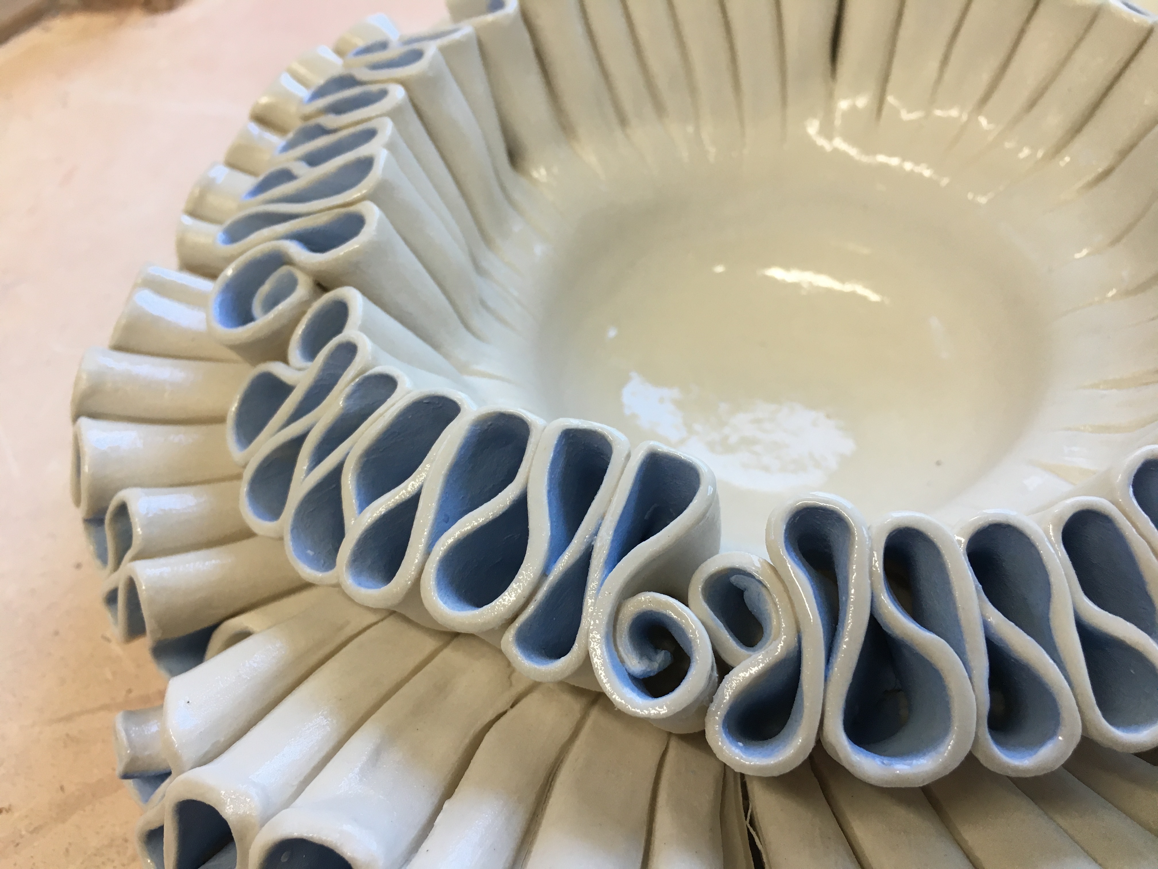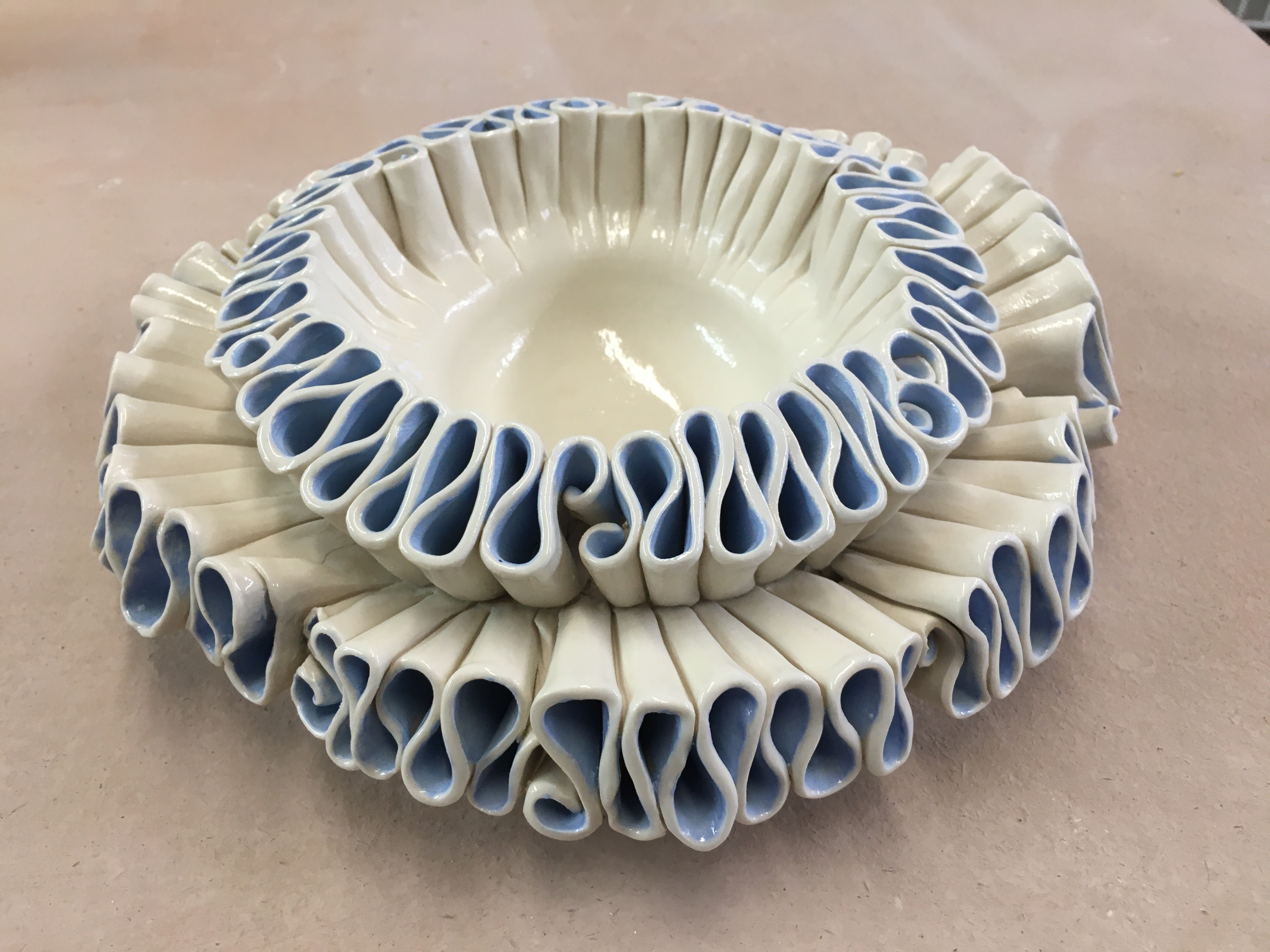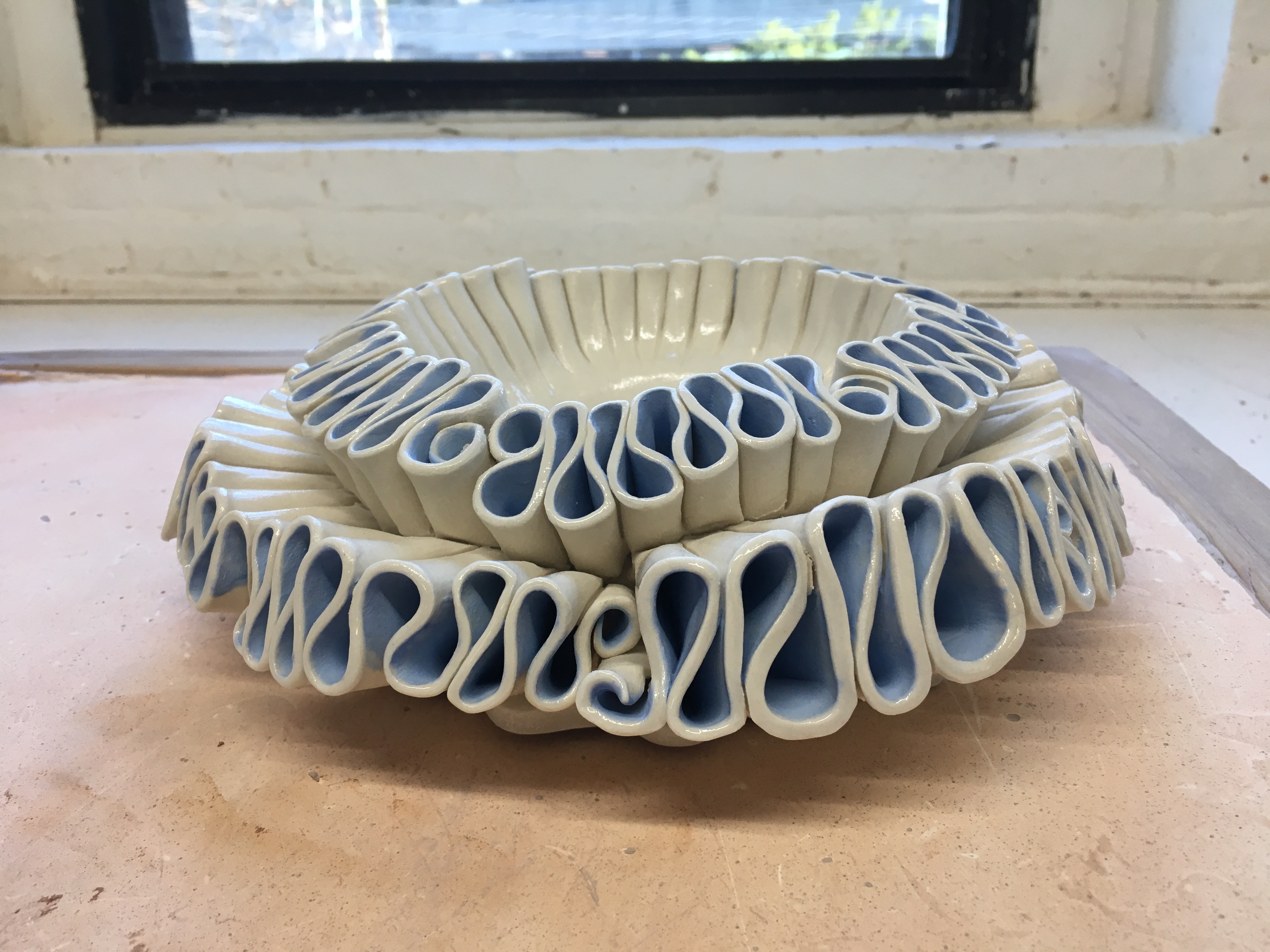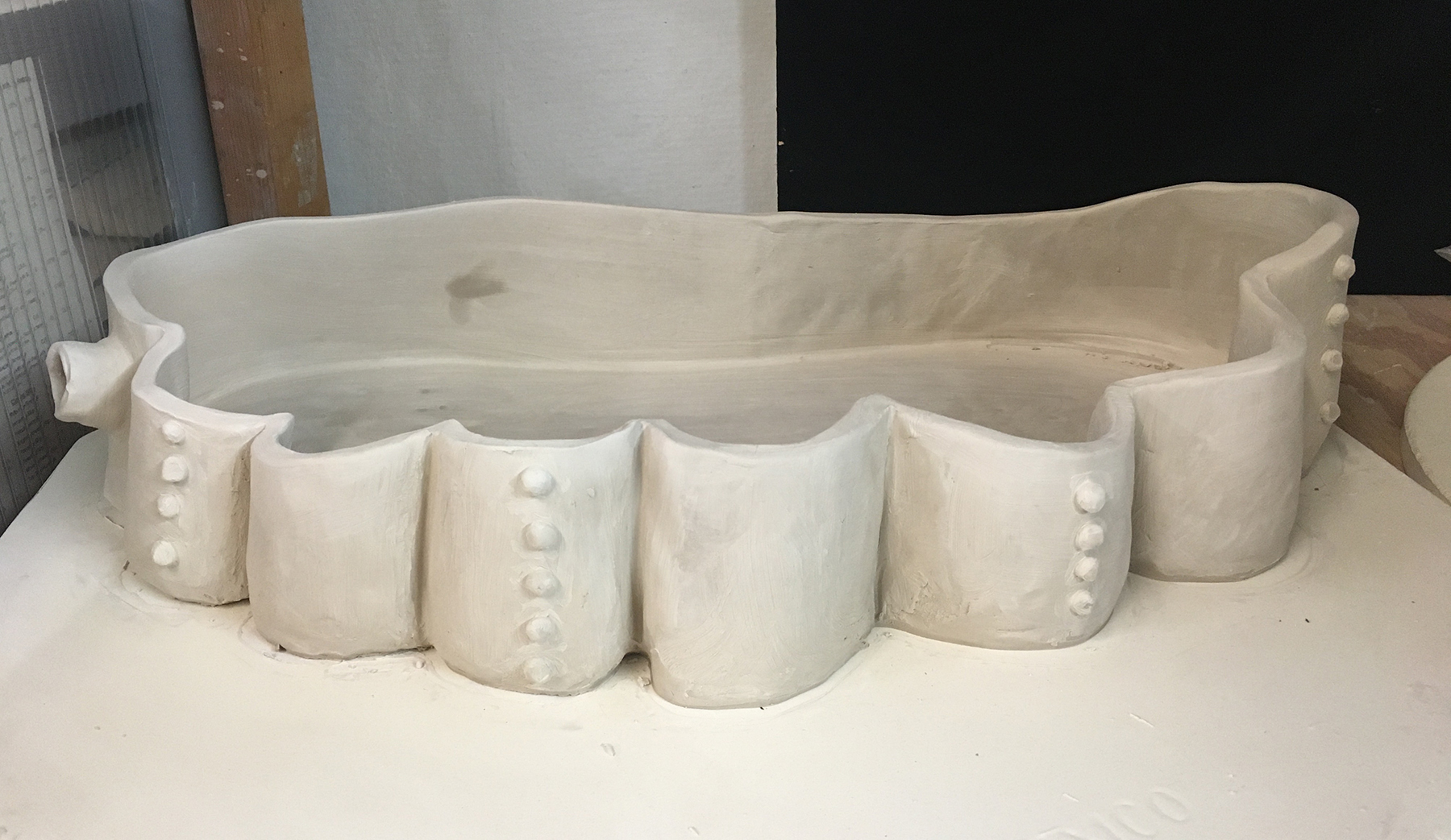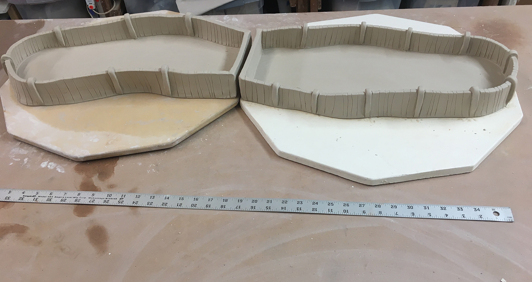 (I had to make it in two halves because they are the maximum size that will fit in my kiln, but they will be connected together later. The walls in the center are just temporary supports; they will be removed later so it will become one long open pool.)