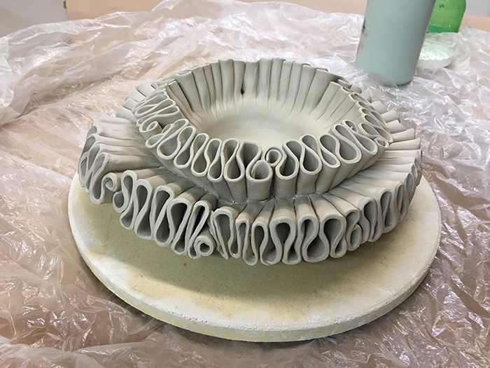 This is a porcelain sculpture I started that is inspired by cloud-bands, specifically those on the top left corner of f80v. This one will have a nymph too, that stands in the center.