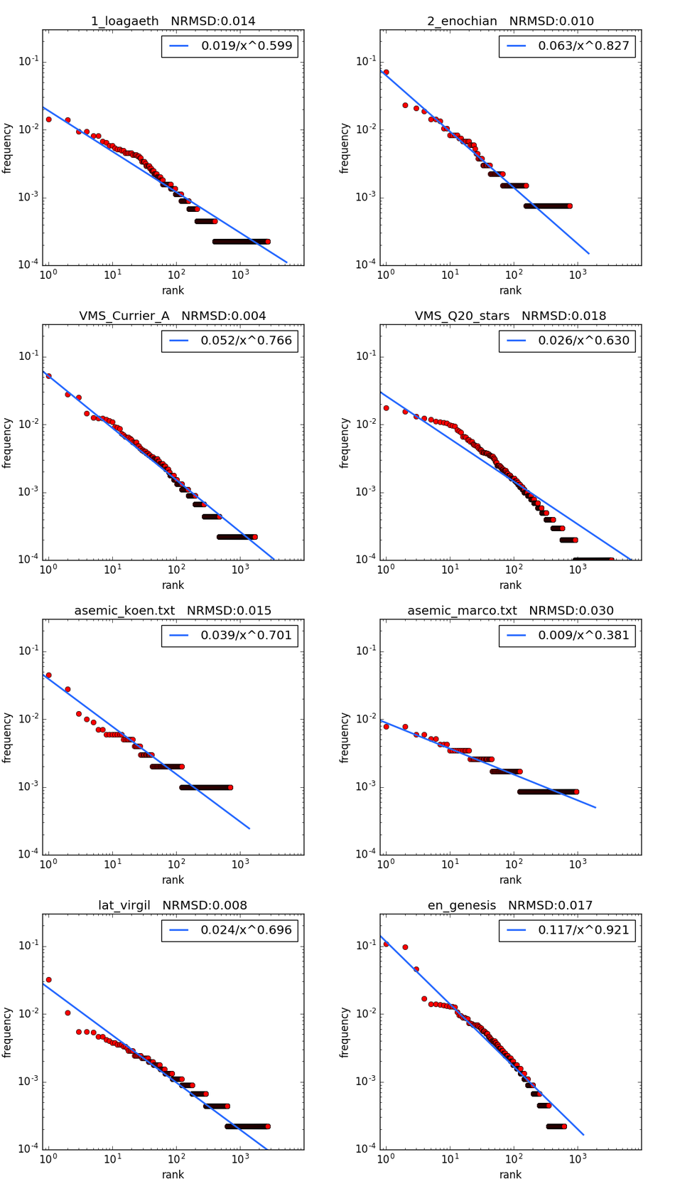While my attempt turned out to mostly be hapax-legomena, Koen wrote some gibberish that nicely fits Zipf's law. Since Koen's text is certainly meaningless, I regard it as empirical proof that Zipf's law is not necessarily the result of language or an algorithm. At the time, I also checked MATTR200 and Koen's text is comparable with language (while mine produces a measure close to the maximum value 1).