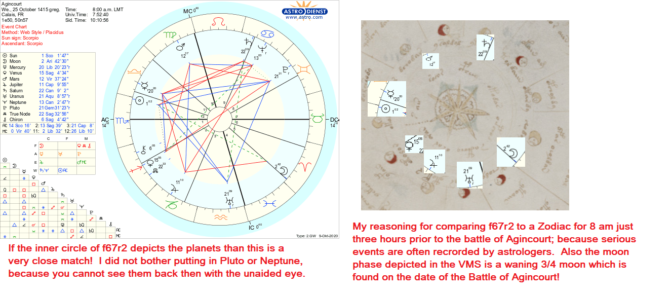 I brain stormed for a few days thinking about provenance, Author type, geography and where in the VMS I could possibly find a possible clue. Folio 67r2 does look like a Zodiac, so I thought would it be about an a big event or for a persons horoscope. Since f67r2 was surrounded by waning 3/4 moons I figured it was for a big event. The planets match up very well with the Zodiac presentation I provided. Also, if one studies the Voynich you will know that in the horoscope series, it starts with Pisces with f70v1 and ends with Sagittarius as f73v! For reasons I don't understand Sagittarius leans in the 1st house of the Zodiac and I think You are not allowed to view links. Register or Login to view. it might have a connection to f67r2. Anyway I determined that by the waning 3/4 moons and by the planets alignments to the inner circle words which might be planets for f67r2 that this represented The Battle of Agincourt on October 25, 1415 and I speculate a Doctor drew this up at 8 am three hours before the battle sprung into action.