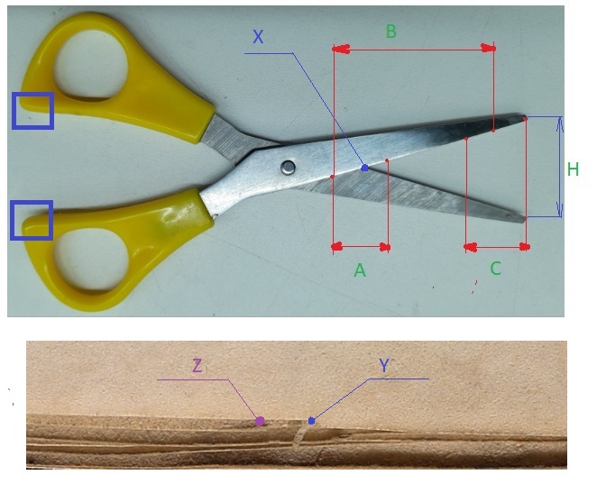 2 / Burr formation. If you made one cut, and the next time you press the scissors, you did not align the X points (scissors) and Y point (on paper), but started cutting from the Z point.