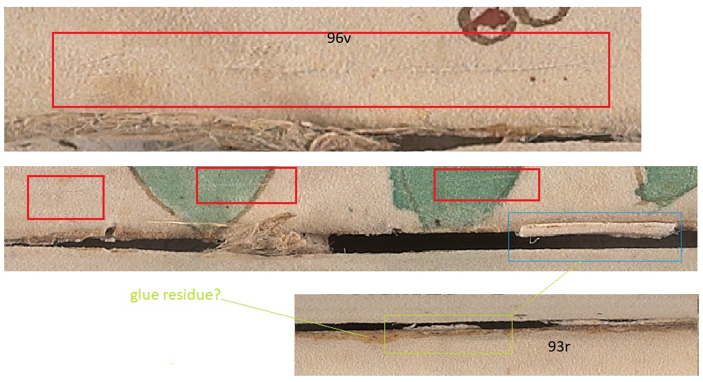 There are cases when consecutive folios are trimmed in different directions, such as with f46 and f47, and there are cases when two pages were trimmed simultaneously, such as f95r1 and f95v2 which were trimmed together in folded state.
