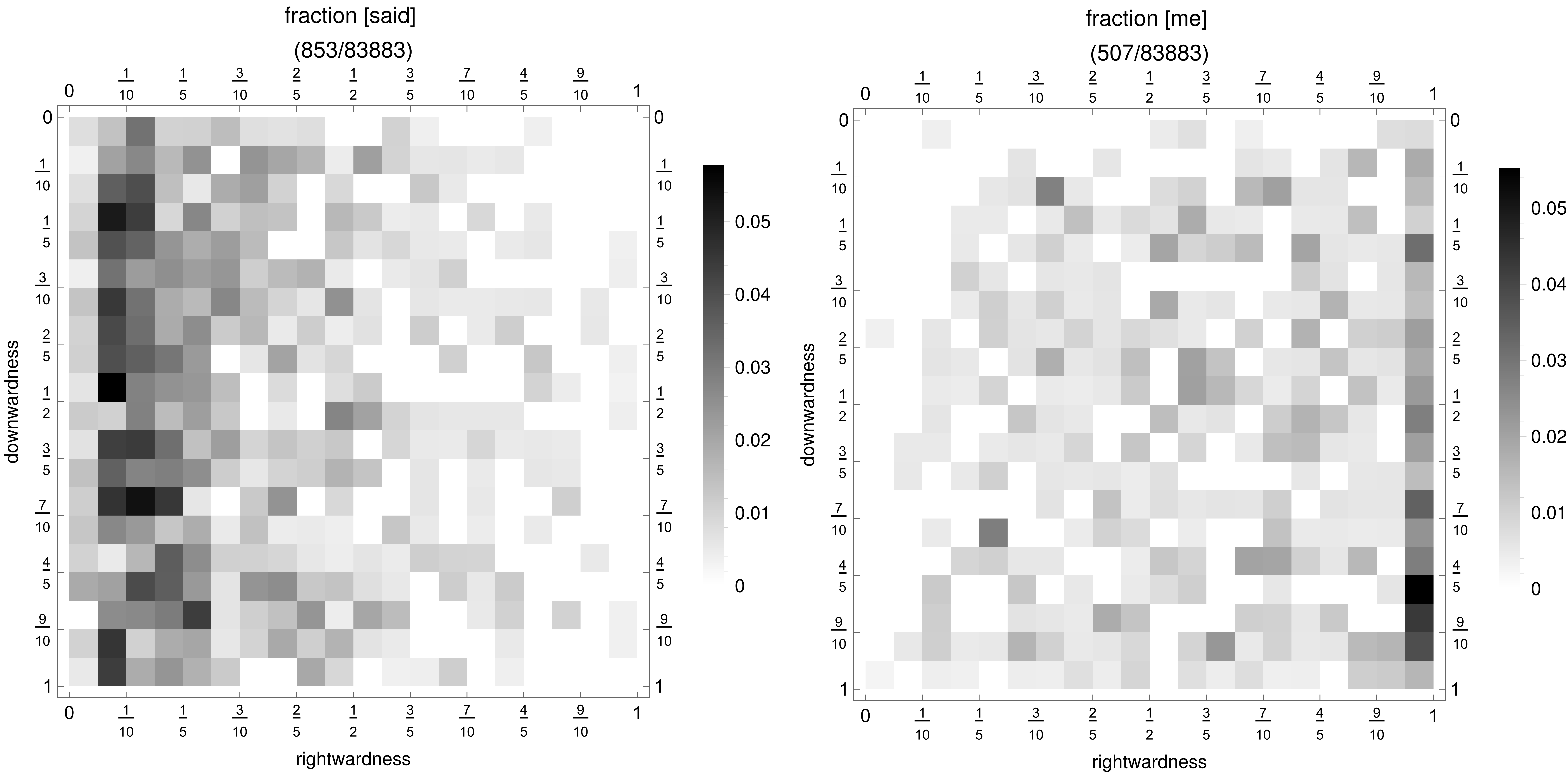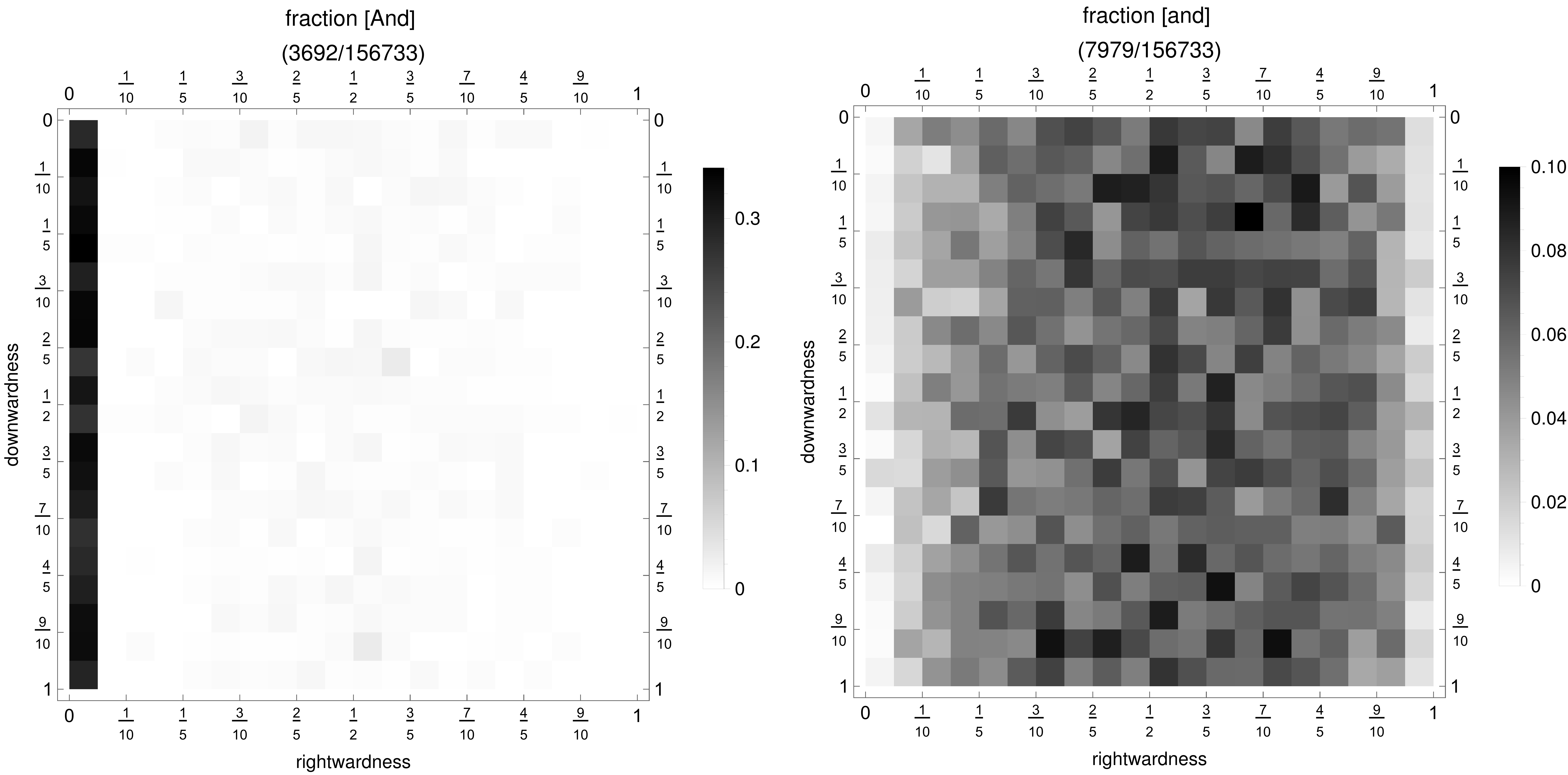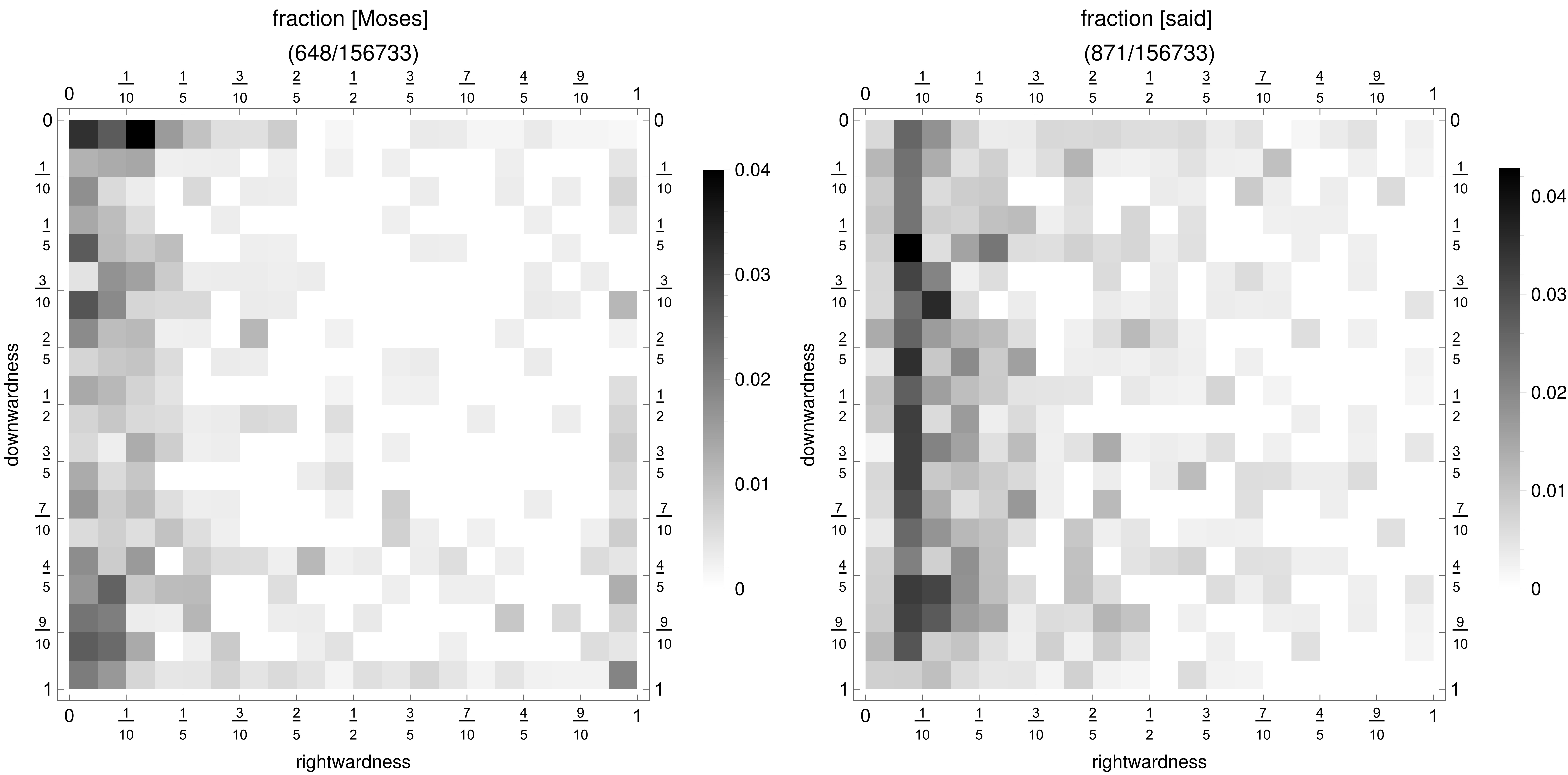 Having a suitable data structure on hand, I pfeasterized the more frequent words in the King James Bible (admittedly not a manuscript) and looked for gross asymmetries. One sample was the first five books of the Old Testament, with chapters parsed as "paragraphs," and grammatically complete sentences as "lines" (which leaves some capital letters stranded at intra-sentence verse breaks). Representative density maps are shown below on a discrete 20 x 20 grid, as justified by the typical lengths of chapters and sentences. Fractional populations of specific words are computed relative to the total number of words in each bin. Greater density is represented as darker gray value.