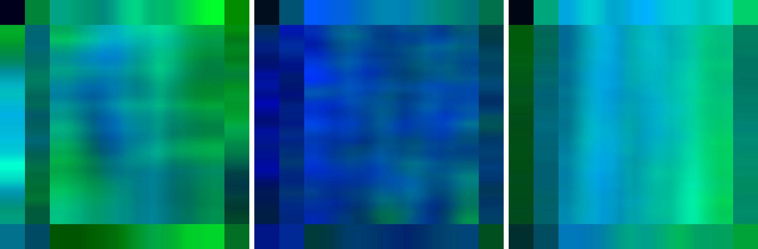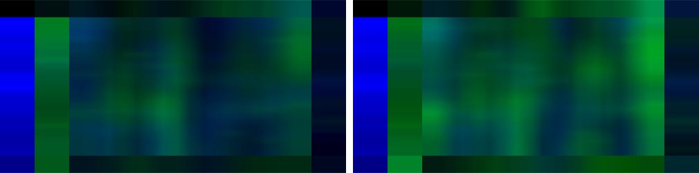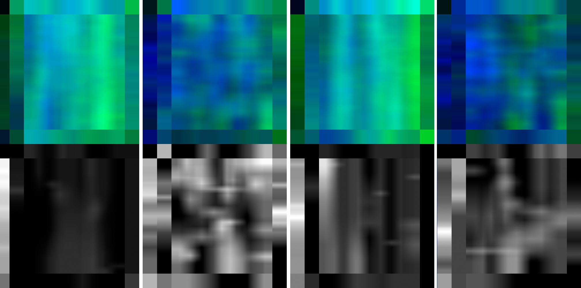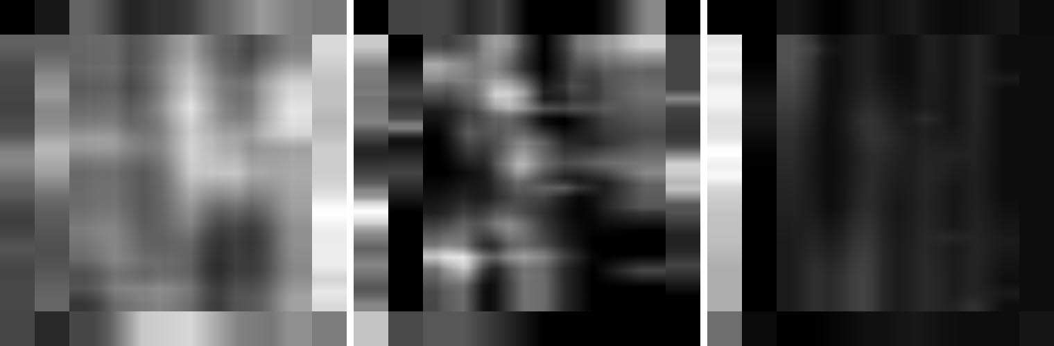 Having a suitable data structure on hand, I pfeasterized the more frequent words in the King James Bible (admittedly not a manuscript) and looked for gross asymmetries. One sample was the first five books of the Old Testament, with chapters parsed as "paragraphs," and grammatically complete sentences as "lines" (which leaves some capital letters stranded at intra-sentence verse breaks). Representative density maps are shown below on a discrete 20 x 20 grid, as justified by the typical lengths of chapters and sentences. Fractional populations of specific words are computed relative to the total number of words in each bin. Greater density is represented as darker gray value.