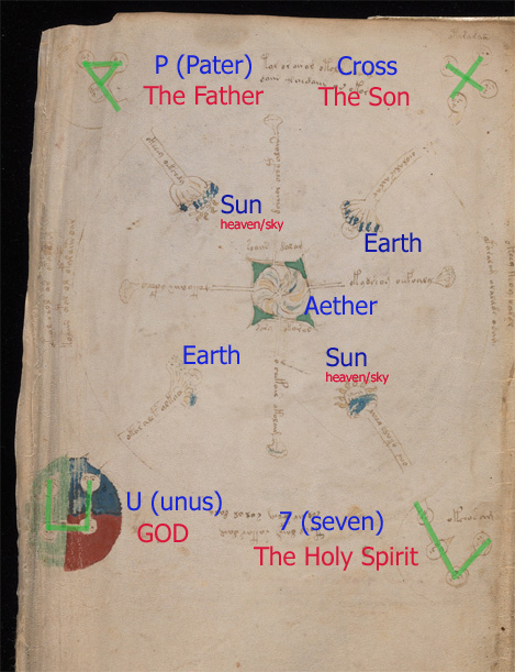 God is represented as a T-O map in the bottom left. Inside it there is a U (unus), three different persons sharing one essence. Each of its parts as an element of the Trinity. Which part/color correspods to each element of the Trinity? This question is opened.