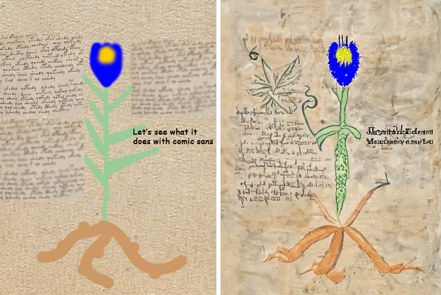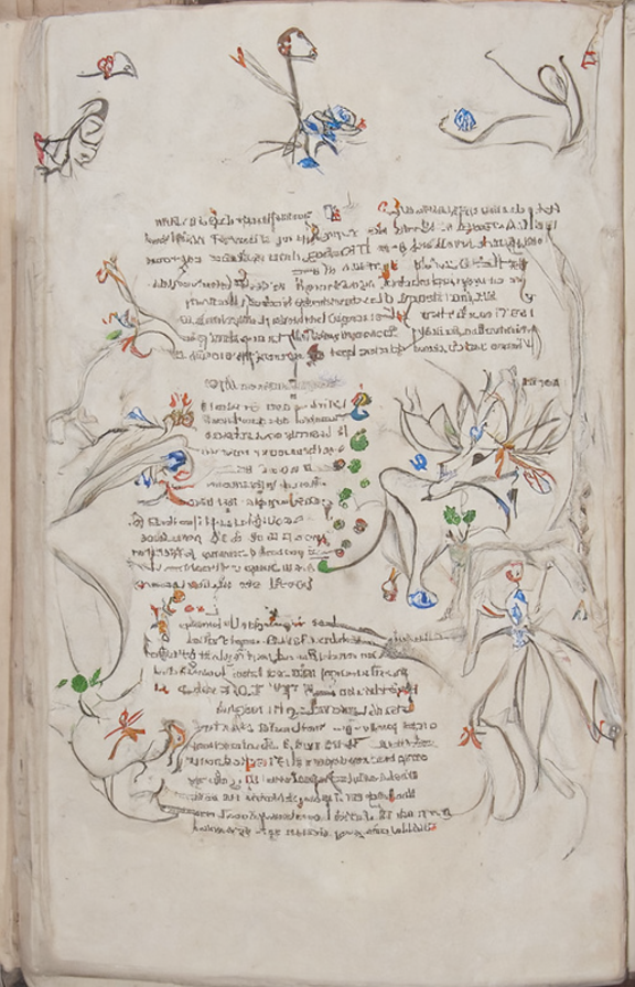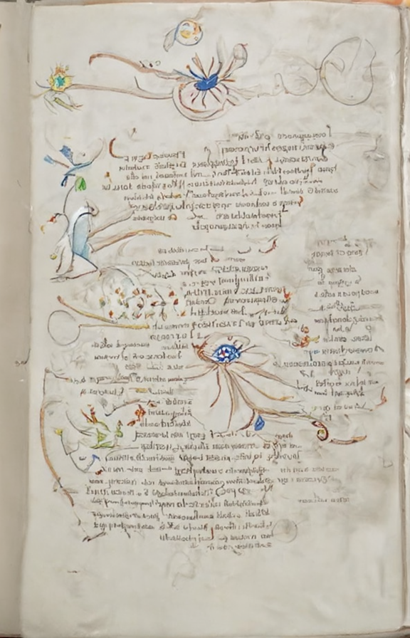 I think the keyword "manuscript" pulls in a lot of interference from "music manuscripts". Therefore I tried to use the prompt "Voynich folio", which made it much worse. It tried to include some book cover in the middle.