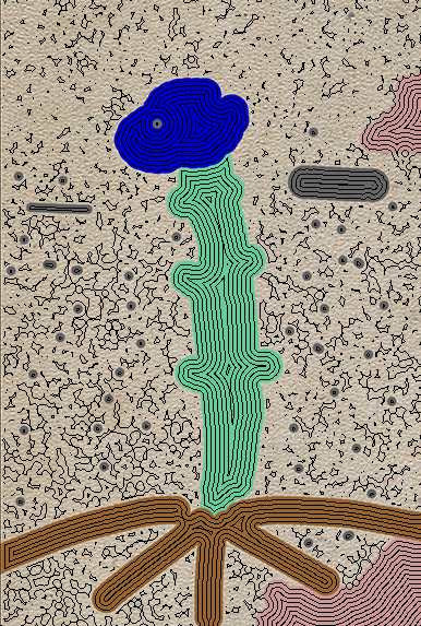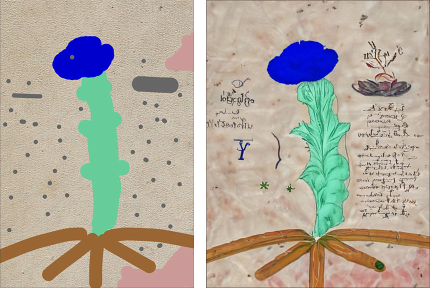 Here's what you get when you start with an initial image and try to nudge it in a certain direction. (I made the initial images vague and simple on purpose). I wanted to let it make a VM plant, but it didn't work as well as I expected. It doesn't seem to be able to handle large, uniformly colored areas.