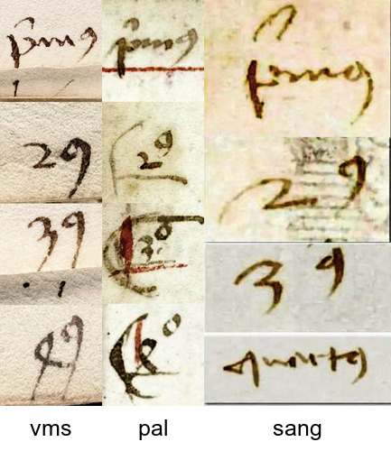 This image compares numerals (primus, secundus, tertius, quartus - first, second, third, fourth) from Voynich quires, the Sang 839 ms discussed by Sauvaget and You are not allowed to view links.