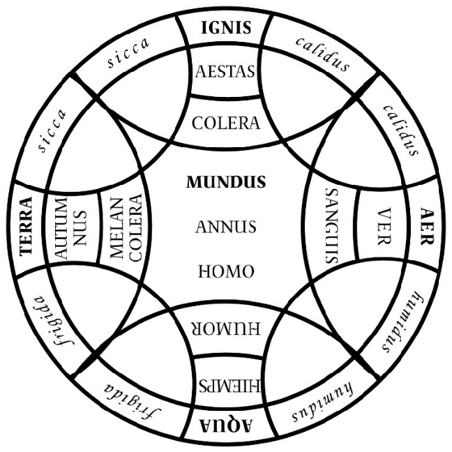 Quote:The diagram in BSB Clm 14300 illustrates the chapter on seasons (or literally “times”, De temporibus) and depicts the four seasons of the year according to their qualities (combinations of hot, cold, moist, dry) and cardinal directions. Winter (north) is cold and humid, spring (east) humid and warm, summer (south) warm and dry, and autumn (west) dry and cold. The connections and oppositions of the qualities and seasons are neatly illustrated with a circle divided by 4 + 4 arcs (qualities + seasons).