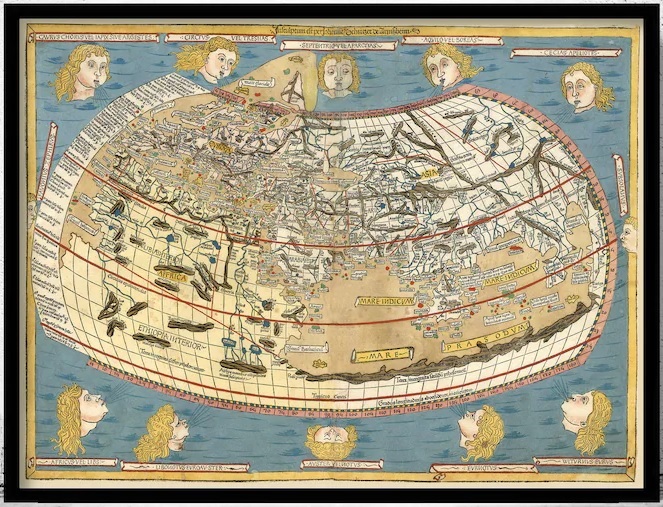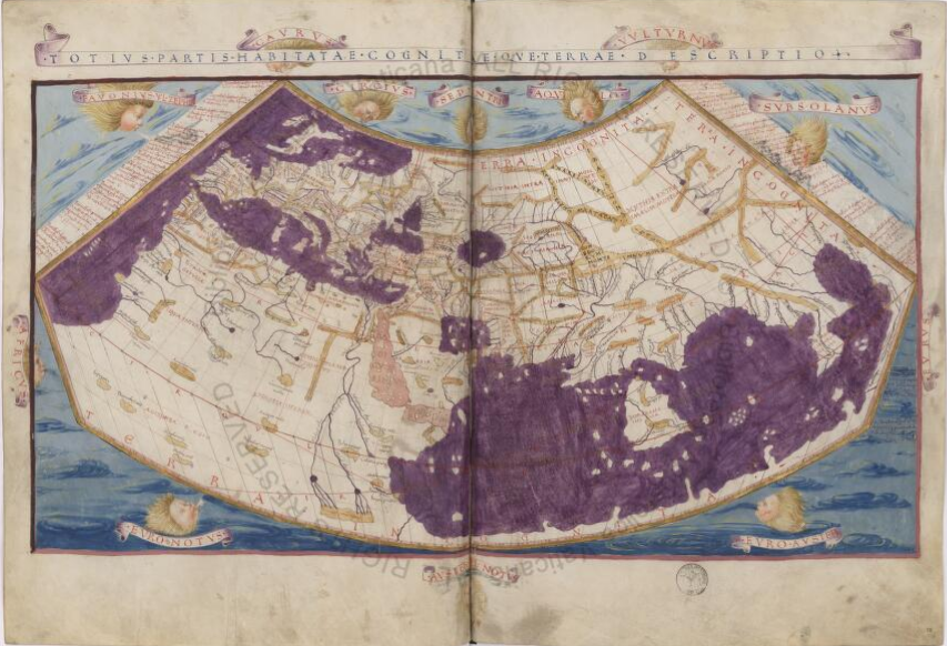 Quote:Diagram of the Winds (I) — "The T-O map of the inhabited world occupies the center of this wheel-shaped diagram. Twelve profile busts of the winds, their Latin names provided in encircling bands, are depicted in the diagram's wide outer ring; the narrower, unpainted ring just within it contains the winds' Greek names. The four major winds are associated with the four cardinal directions, with East located at the top of the wheel. The busts of the winds blow toward the Earth at the center of the diagram, and their breath, represented as green strokes, flows into the wheel's "spokes." Each spoke bears a brief characterization of the associated wind, and these are expressed mainly in the first-person, as if spoken by the wind itself. Thus, the spokes of this diagram function like speech bubbles in a modern cartoon."