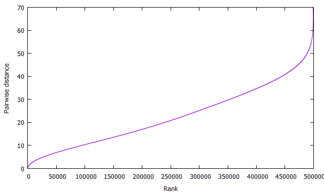 While there is a small overlap in the tails, there are still clearly two distinct underlying distributions. Plot2_GaussClustRankOrdPairDist.png is the corresponding plot of the rank-ordered pairwise distances: