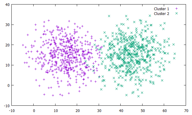 Plot1_GaussClusters.png is a plot of two clusters (500 points each) generated by circular Gaussians (both with standard deviation = 7.5, one centered at (15, 15) and the other centered at (45, 15):