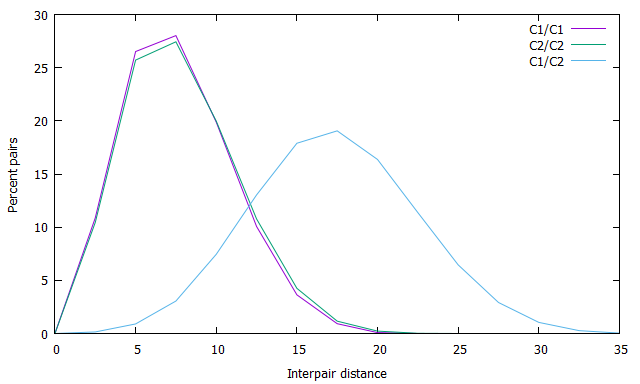 If instead of looking at the rank ordering of all pairwise distance you look at the within-cluster vs. between-cluster distributions of pairwise distances, you get this: