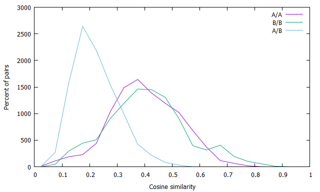 Login to view.), using all text (running text, labels, diagrams, etc.) and ignoring uncertain spaces), this is what I get for the corresponding plot using cosine similarity on the A and B language folios -- note the same pattern of higher average within-group similarity compared to between-group similarity.