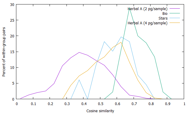 With respect to the heatmap, Rene is correct that smaller average token counts explains the lower within-group similarity of the herbal folios. Comparing Herbal A with the Bio and Stars sections, this show the effect on the cosine similarity if you have 4 pages/sample rather than 2 pages/sample (= folio). Note the within-group similarity using two folios/sample become comparable to the Stars section using one folio/sample. (While it would make sense to use the herbal bifolios as samples, it was quicker to code it combining pairs of sequential folios, separating the Herbal A and Herbal B folios).
