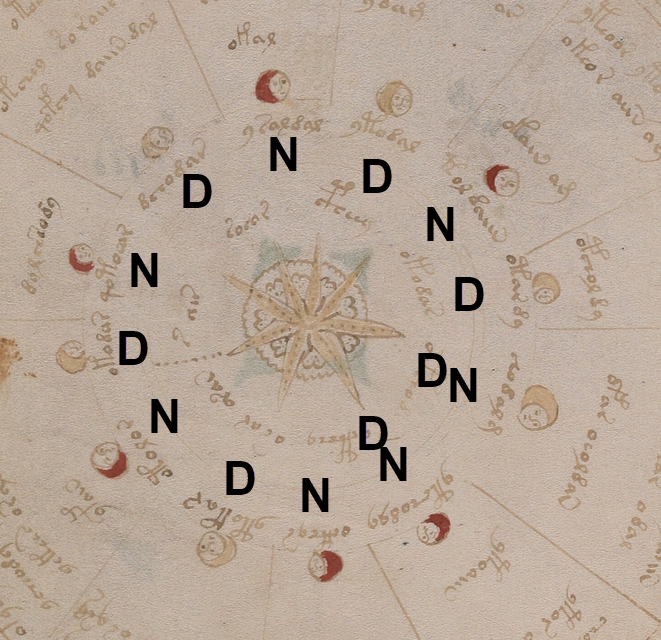 There is an easier way to look at this. The very pattern of night and day domiciles was created in a way that would make the domiciles iterate between day and night, and putting the Sun at the beginning of the day chain and the Moon at the beginning of the night chain. So, whenever there is a break in D-N-D-N-D-N pattern, as in the lower right of f67r2, it it impossible to match this to day and night pattern correctly.