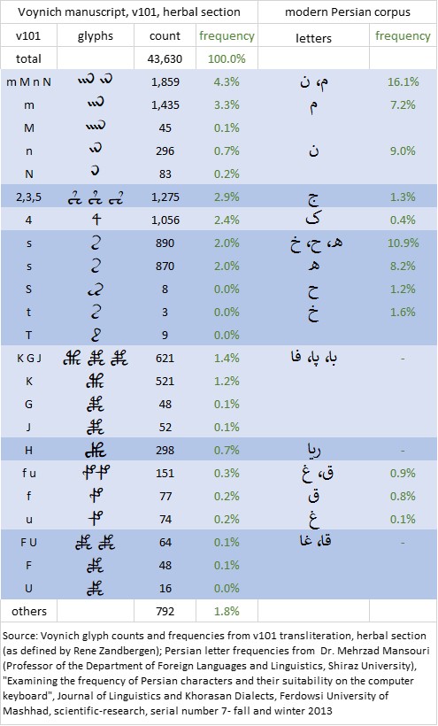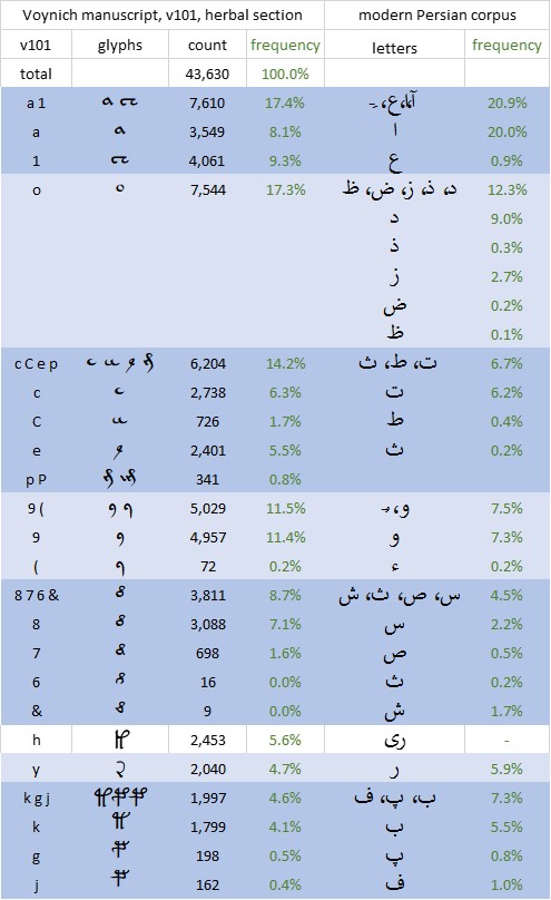 If we use the v101 transliteration, herbal section, as the corpus of reference, as illustrated in the tables below, there is in most cases a large difference between the frequency of the Voynich glyph (or glyphs) and that of the Persian letter (or letters) proposed to correspond.