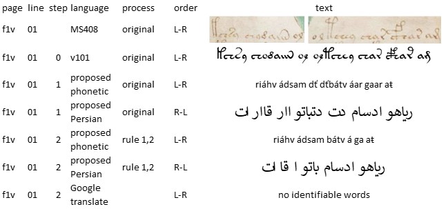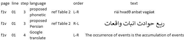 (22-01-2024, 07:33 PM)dfs346 Wrote: You are not allowed to view links. Register or Login to view.Here's an example of a Voynich line (f1v, line 1, the first line of the herbal section), transliterated to Persian using the proposed mapping. Where there were several possible Persian letters, I selected the most common.