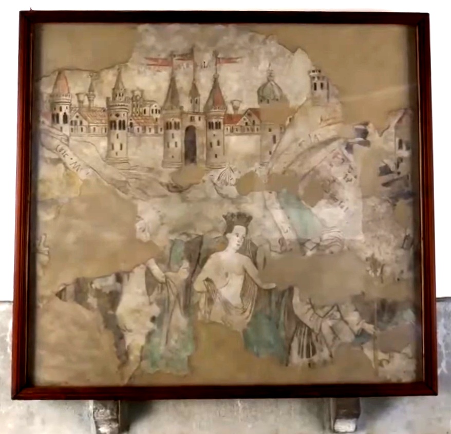 Google translation Wrote:Furthermore, at the entrance to the Carnico Museo there is part of a framed fresco which illustrates the town of Tolmezzo in the 15th century with the castle, walls and towers, a watercourse around it and four female figures in the foreground. The central figure – with a veil and a crown, naked and close to the watercourse with a globe in her hand – recalls both one of the figures of folio 57v and one of the female figures in the so-called “treatise on waters”.