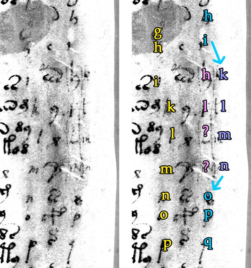 Thank you for posting this! I actually didn't realize until now how much difference there is. This is version 12 of the model, the past images were from version 4. When you just see the small iterative changes with each new version, they don't appear to bring out too much new detail. The main difference between v4 and v12 is the number of extra training points used. Initially I trained models on individual pixels, but then I realized that whatever point I mark as ink/non ink, given the high resolution of the TIFFs, the immediately adjacent pixels in almost all cases should have the same inkness so to say, and they appear to have substantially different values (a lot of variation between adjacent pixels in the images). So I could sample from up to 8 additional pixel values for each manually selected point. In version 12 I settled on using 4 pixel values for each of the manually marked samples - the center pixel and 3 of its immediate neighbors, selected (pseudo)randomly.