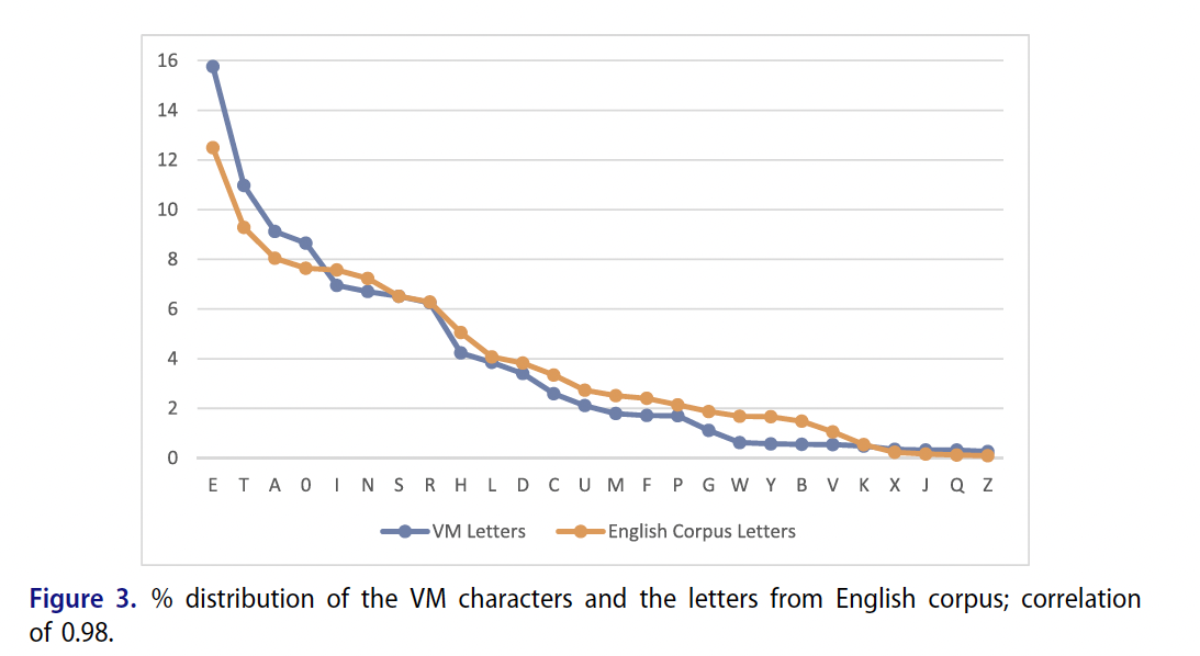 In 4.2.2 the paper compares the VMS with a english text and states: "The trend lines closely match each other and provide a reason to examine if the ‘o’ of v101 is the ‘E’ of English and if other VM characters may be in the vicinity of the other letters of the English alphabet, when reviewed in the rank order." (see Figure 4)