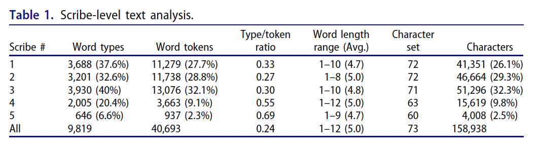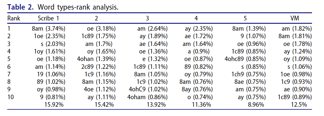 - "It may be noted that all five scribes used six or more word types that featured as the top ten in the entire VM, thus indicating that the Scribes were using similar words and therefore by implication, drawing from the same language."