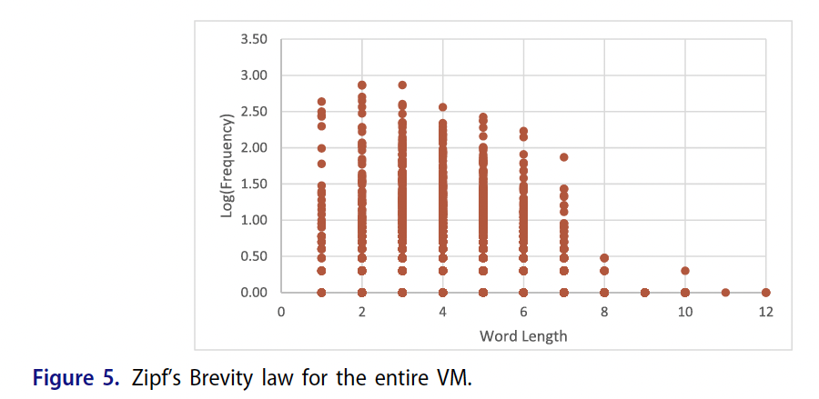 About Zipfs law the paper states: "The linear fit of the resulting curve yields a near-perfect R2 of 0.99, thus showing the significant Zipf of the VM text. These results agree with the natural language hypothesis for the reasons provided by others (Landini 2010; Reddy and Knight 2011; Bowern and Lindemann 2020)."