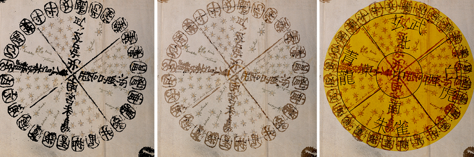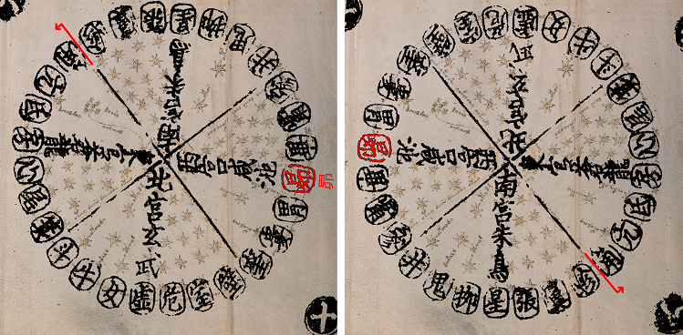 Each character in the outer ring corresponds with one constellation or a star. 昴 are Pleiades, 角 is the brightest star in Virgo, etc.
