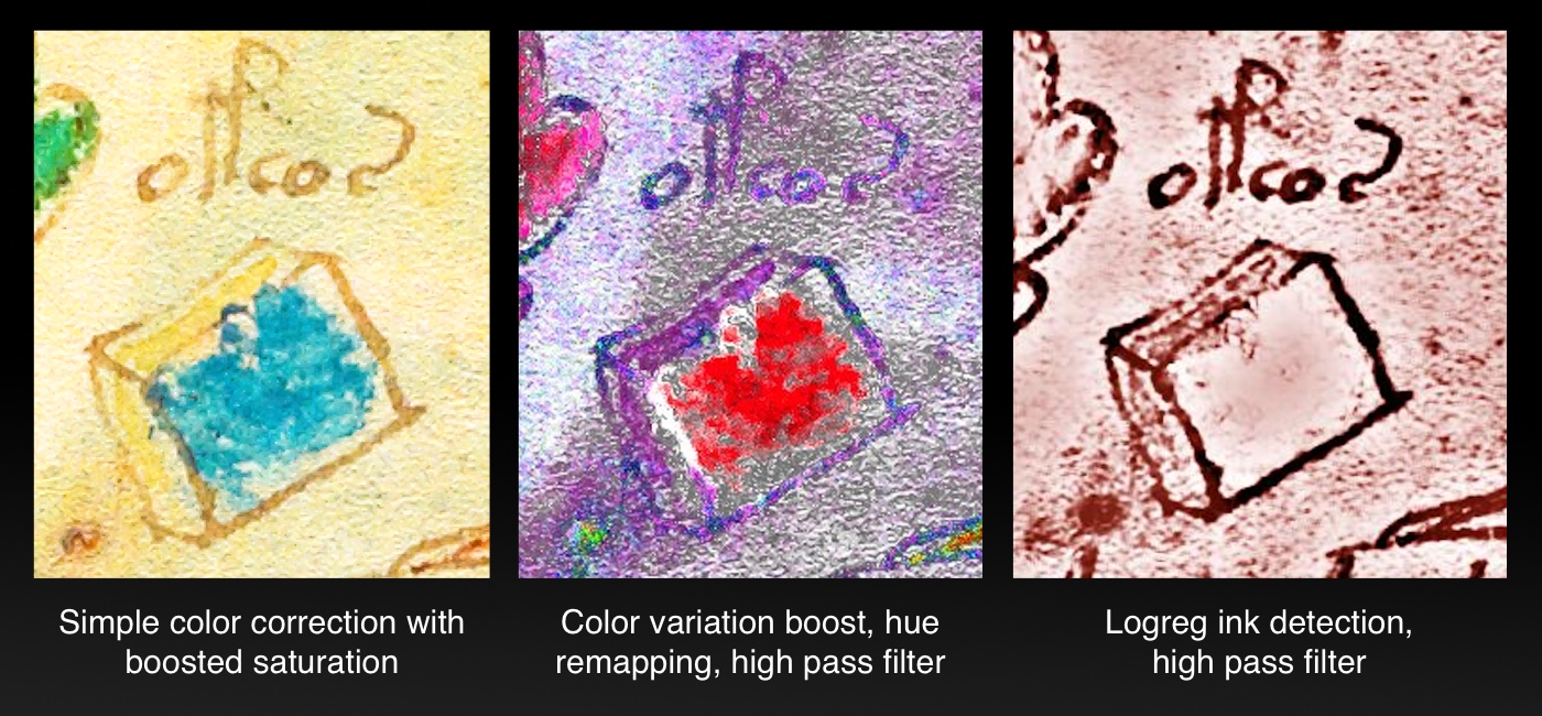 Personally I think more is better Vessy, after all it does seem to have settled an old debate on what people saw in the paint - Words, eyes, 2 clasps were a few. Plus I am a bit sceptical at taking the paint at face value, there's a good chance anything between red and blue could end up blue, and anything between red and yellow could end up yellow.. and much more on pages where they had restricted colours for whatever reason. So it could be telling a lot, or influencing a lot in the wrong direction. Not to mention it could have been added later by someone who also couldn't read the manuscript and we are taking their interpretation as the original artists. I guess we aren't left with much choice but to hope for accurate clues on some cases though, such as a block..