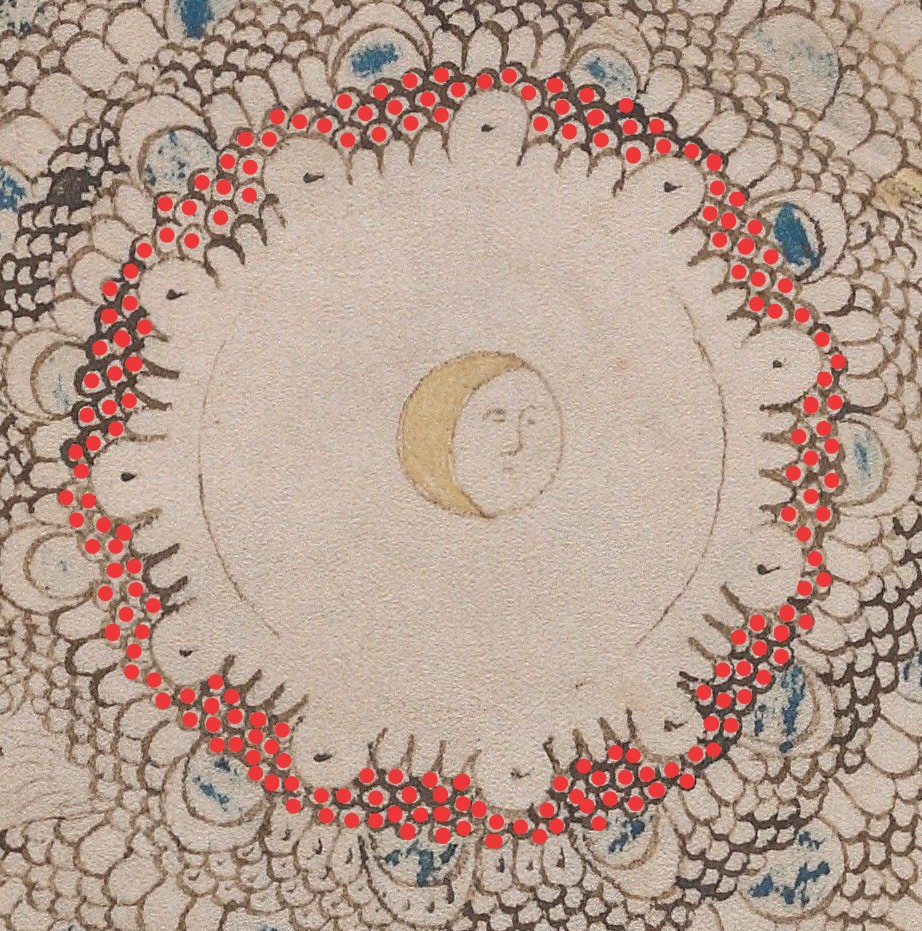I counted 190 small bumps in the 2nd layer from the top of the roundel in the lunar folio (shown as red spots).