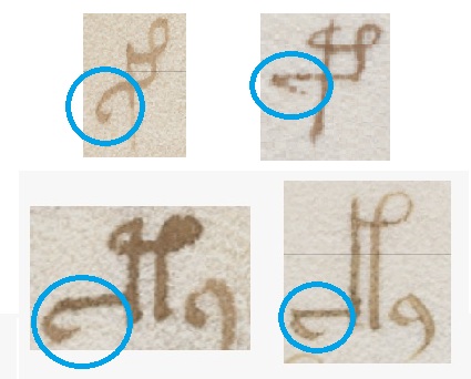 Retracing is often obvious in the plumes of r and s and the tails of y and m. In the original scribing, a plume or tail is smoothly curved and becomes gradually thinner and lighter, ending in a sharp needle-point. The shape is produced by a swift stroke of the pen, while gradually reducing the pressure along the way.