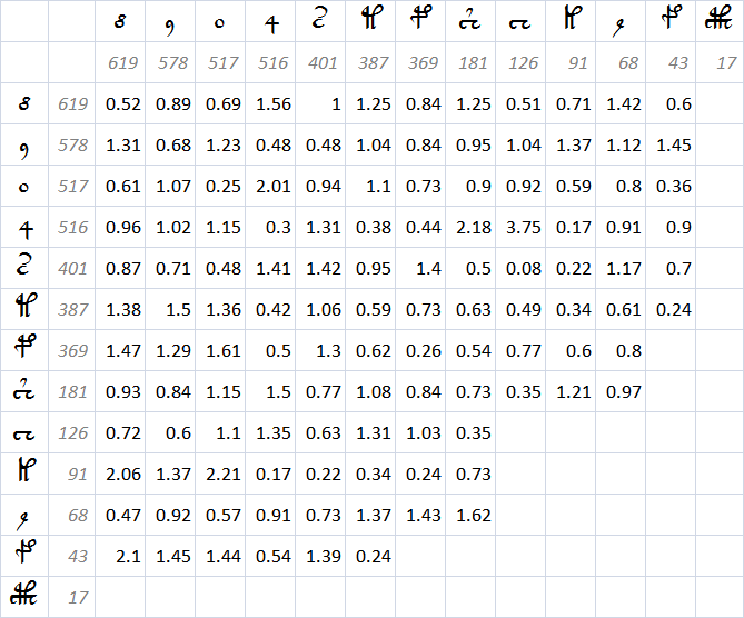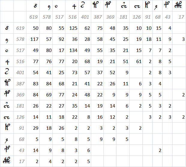 Taking only paragraph text from the GC transliteration and not including lines spanning page breaks, the matrix of occurrences for the character pairs is given here.