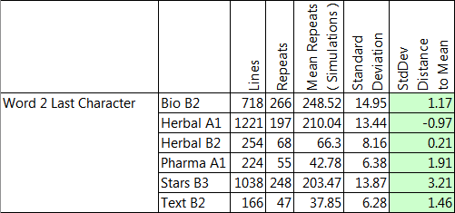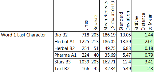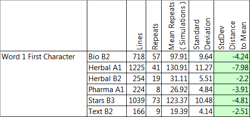 The final column gives the number of standard deviations that the actual number of repeats exceeds the expected. This shows that all sections of the manuscript exhibit the same behaviour and the behaviour is statistically significant. The numbers of repeats are far below expected. In particular Herbal A1 has 41 repeats when 131 were expected. Anything over 4 standard deviations is a huge distance.