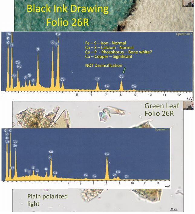 Regarding Joseph Barabe's talk, the copper content in the ink from the text example on 26r looks to be very low, and this is consistent with text on 78r - not the whole ink test, just copper. The amounts of copper jump substantially on the painting outline ink taken from 26r, which Joseph notes as "significant". The ink again goes back to very low amounts of copper on 70v taken from the drawing of a nymph.