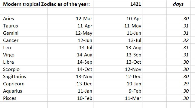 Next I should elaborate on the Zodiac boundaries. At first I just took the modern understanding, just correcting it back to the Julian calendar of the year 1421 (9 days difference). This table is shown in Fig. 1 below.