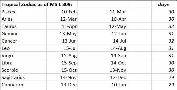 On to my idea. In that very unfortunate circumstance that there are no calendars with regular succession of 30-day months (bar the doubtful Dionysios), I decided to explore Rene's suggestion above that the number 30 relates to Zodiacal degrees rather than days. I further supposed that the whole stuff might be not a pure Zodiac, nor a pure calendar, but rather some mix of the two. I dropped the idea that the series starts with March 1st and adopted the more popular idea that it starts with the vernal equinox, as the European tropical Zodiac would.
