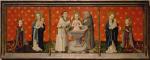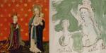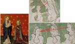 This is the image (below) I'd like to point out some comparisons to. The Wiki description is "Scenes from the Life of Saint Catherine of Alexandria, Germany, c. 15th century, You are not allowed to view links. Register or Login to view. -This three-part panel was originally part of a large altarpiece whose central image probably represented Saint Catherine with the wheel of her martyrdom. The left-hand panel depicts her vision of the Madonna and Child: the Christ Child did not find Catherine worthy because she wasn't baptised and refused to look at her. The middle scene illustrates her baptism. The right-hand panel presents her second vision of the Madonna and Child: as a baptised Christian she is now worthy in Christ's eyes and she is joined to him in a mystic marriage. The delicate figures reflect the continuing influence of the International Gothic style. Swabian painters of the following generation developed a more harshly realistic style."