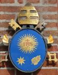 2. "Pinecone shape". On top of the head of the lady with the ring is a "Pinecone shape". This might be meant to be an decorative item, a non-descript flower or top of a crown with a design. An interesting comparison could be made to a "nard" or "spikenard" which can be seen below in Pope Francis's crest and it is a symbol for Joseph (below) left is the star for Mary, top "IHS" for Jesus. However the nard for Joseph was a later association (around 1600).