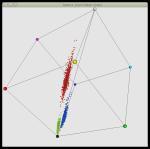 Look at the colors of those pixels as points of three-dimensional space, within the unit cube where (0,0,0) is black, (1,1,1) is white, (1,0,0) is red, etc. Here is an example with three subsets of a page, representative of blank vellum (red), dark text ink (green), and green paint over blank vellum (blue):